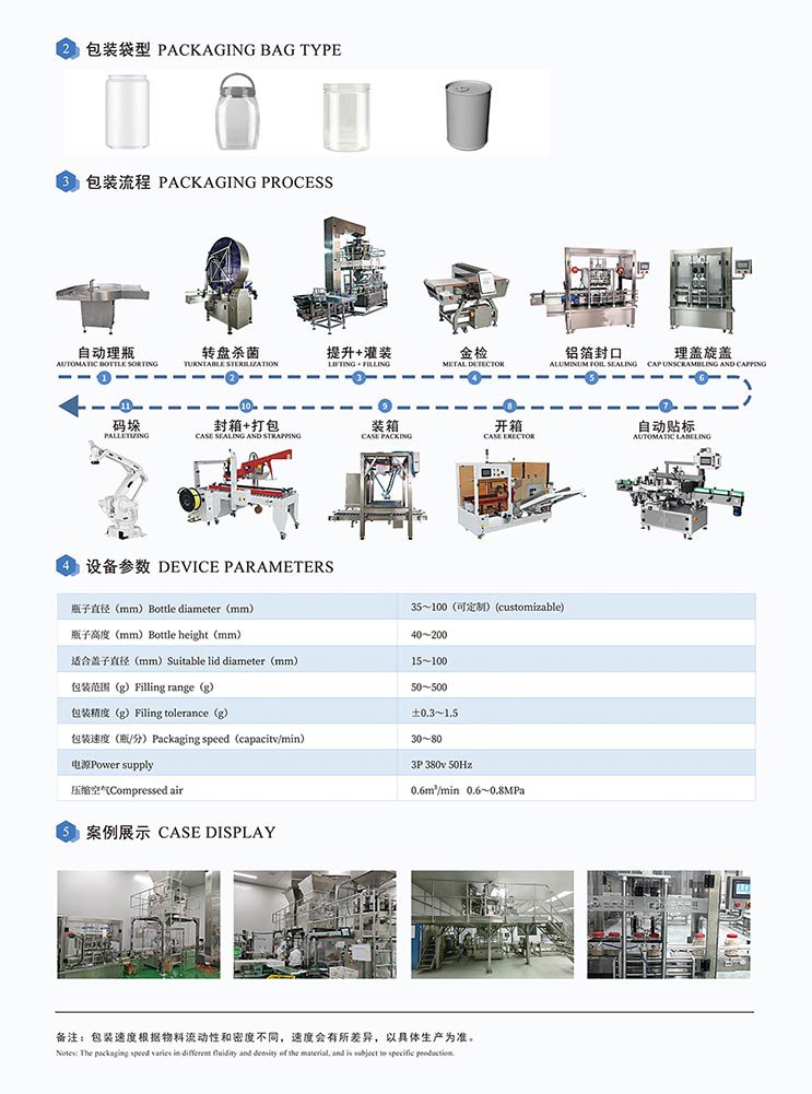 在功能上,全自動灌裝生產(chǎn)線不僅滿足了基本的灌裝需求,還融入了封口、貼標(biāo)、打包等一系列后續(xù)工序,形成了完整的生產(chǎn)閉環(huán)。這種全自動化的設(shè)計不僅簡化了生產(chǎn)流程,還大大提高了生產(chǎn)效率。同時,生產(chǎn)線還支持多種包裝形式的切換,如PE罐、鋁罐、紙罐、馬口鐵罐等,滿足了市場多樣化的需求。