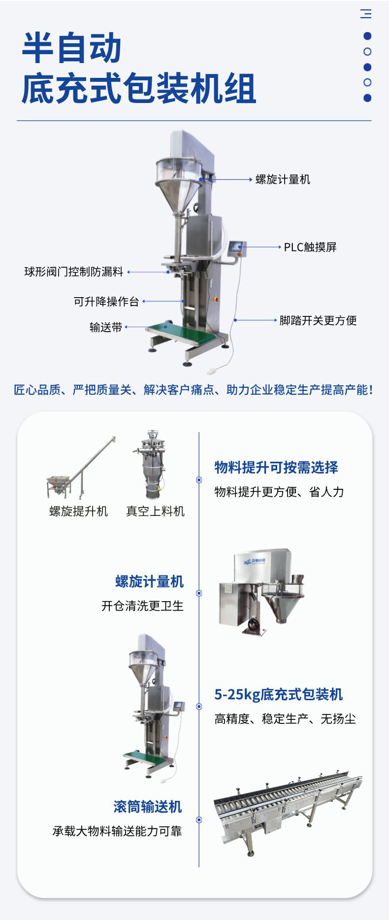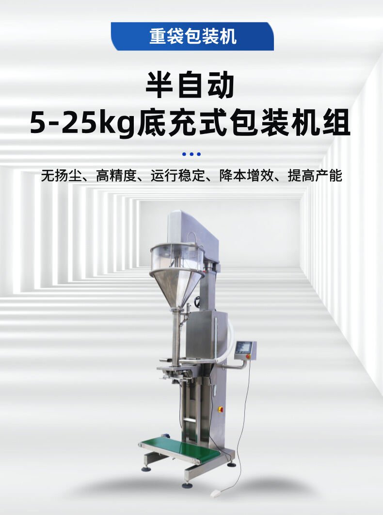 該機采用底充式灌裝,灌裝過程中從底部進行充填,落差小,無揚塵,適用于包裝精度要求高的,或密度不均勻的,流動性好的或者流動性差的粉末、小顆粒物料。